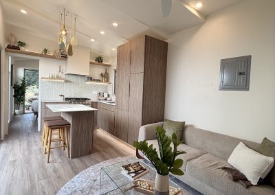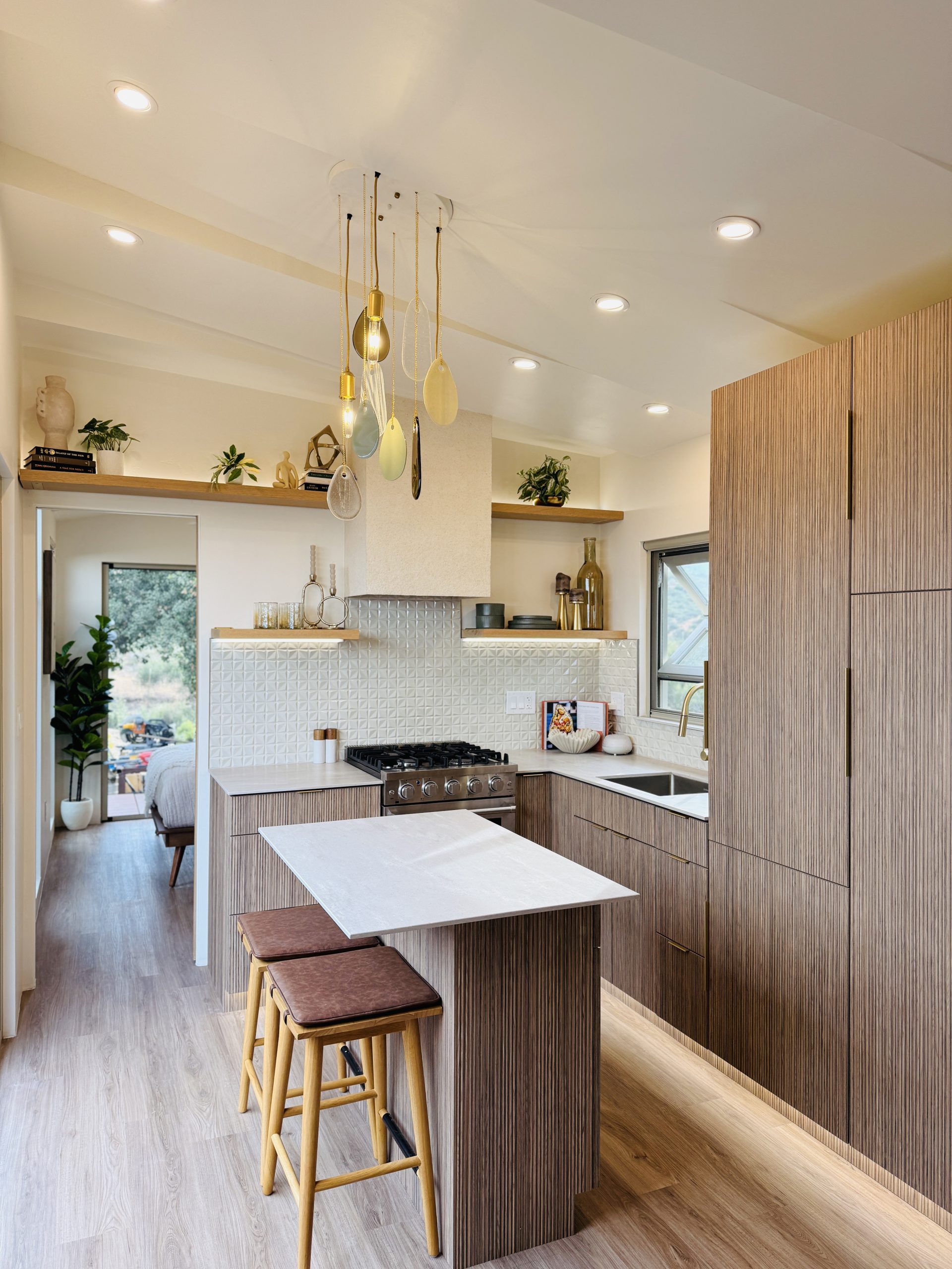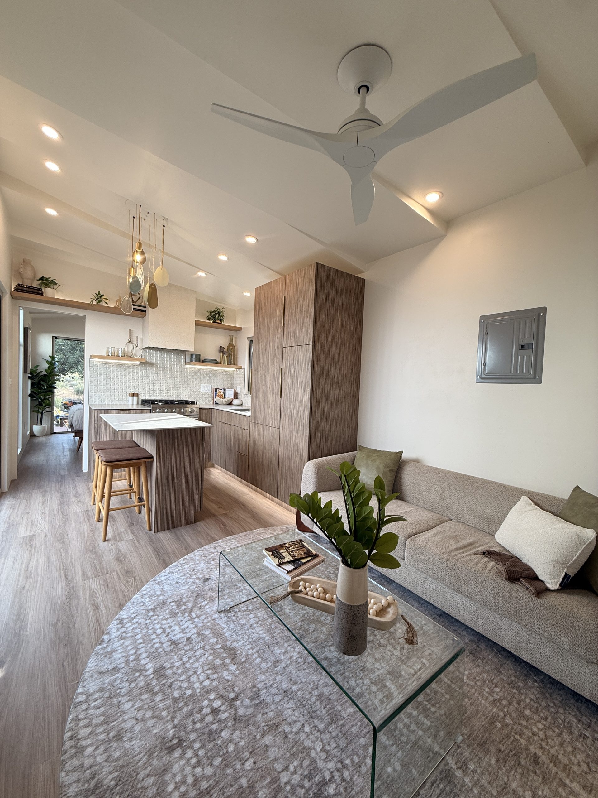 This exquisite tiny home captivates with its harmonious blend of luxury and nature. A custom copper hood vent crowns the chef-worthy kitchen, its warm patina catching golden light that streams through floor-to-ceiling windows framing breathtaking views. Outside, a natural waterfall cascades over the roof, its gentle melody providing a soothing soundtrack to daily life. Ingenious space-saving solutions showcase meticulous craftsmanship throughout. This sanctuary, with its sustainable design and seamless indoor-outdoor flow, offers a peaceful retreat where relaxation pervades every thoughtfully curated corner.